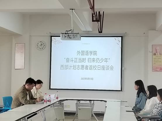 5月13日下午两点,在15栋教学楼1209会议室举行了以“奋斗正当时,归来仍是少年”为题的西部计划志愿者返校日座谈会。座谈会由新利(中国)团委负责人辛雅婷主持,2023届部分毕业生参会。