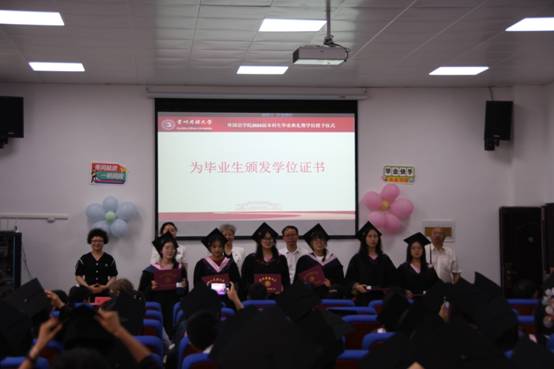 最后,卢文芸书记宣读了《关于授予2024届欧明月等153名毕业生学士学位的决定》。主席台领导为毕业生们逐一拨穗并颁发学位证书。