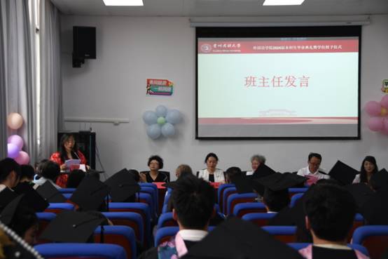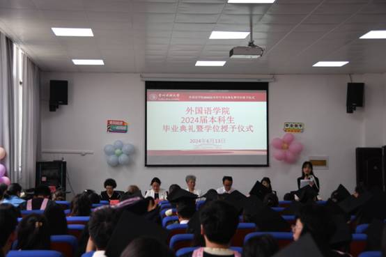 2024年6月13日下午,新利(中国)2024届本科生毕业典礼暨学位授予仪式在北校区外语楼416会议室举行。新利(中国)党委书记卢文芸、院长张广勇、党委副书记杨泰黔、副院长禄颖、副院长赵艳、正处级组织员韦光明出席活动,学院全体专业教师及2024届全体毕业生参加典礼。