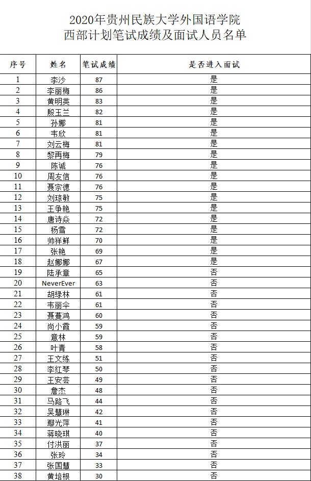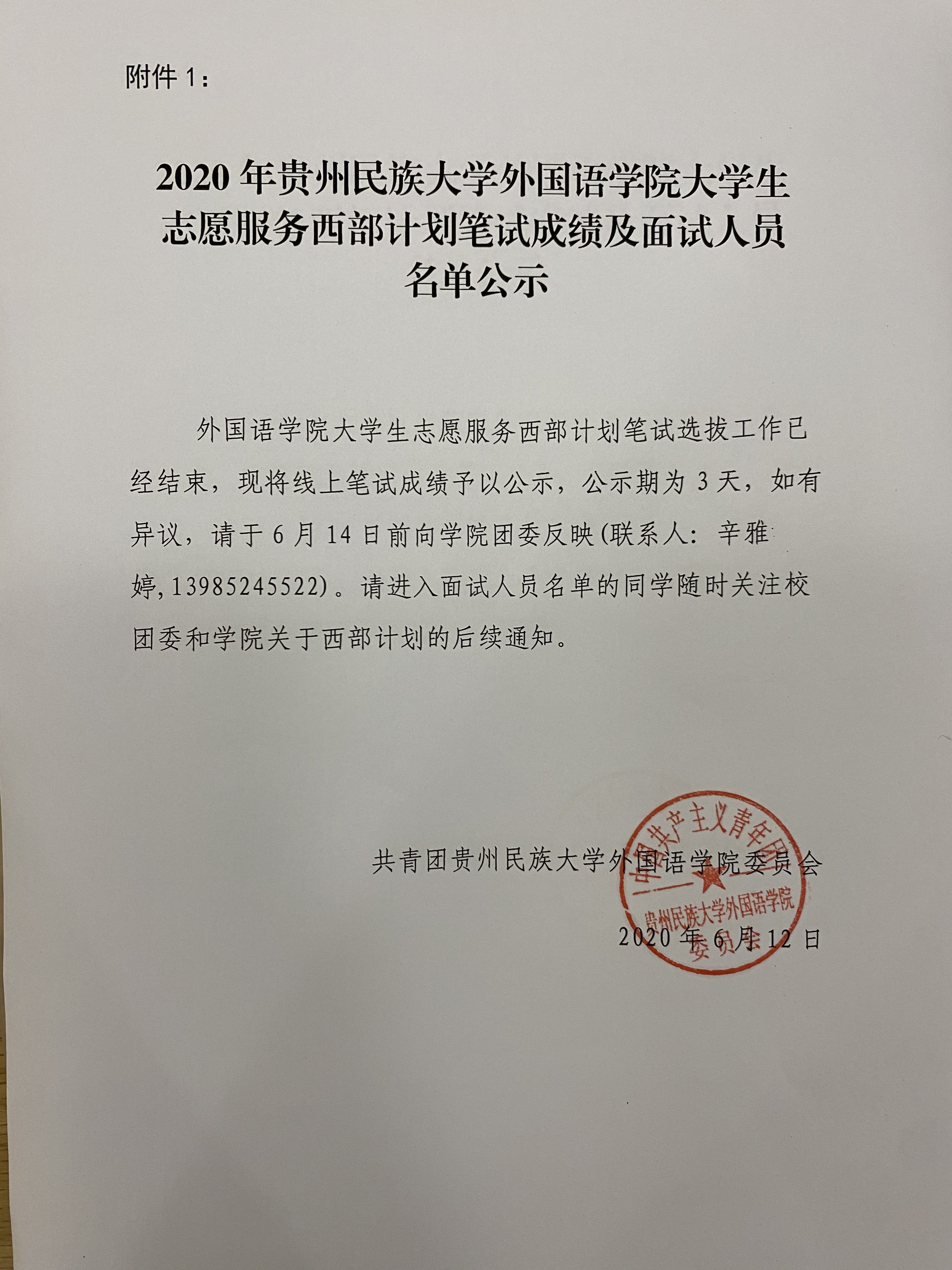 2020年新利在线登录大学生志愿服务西部计划笔试成绩及面试人员名单公示